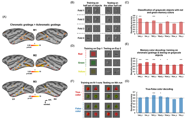 研究人员首先通过对比猕猴大脑对彩色光栅和灰度光栅的响应,为其定义出颜色知觉加工区(图1A)。接下来,研究人员借助多体素模式分析(MVPA: Multivoxel Pattern Analysis)证明了V4d_c,TEO_c,和TEad_c这三个颜色知觉加工区可以区分出具有不同记忆颜色的灰度物体,比如对灰色的草莓和猕猴桃有着不同的响应模式,而对灰色的草莓和西瓜的响应模式则更为类似(图1B&C)。为了进一步验证猕猴对这些灰度物体记忆中的颜色和实际感知经验相符,研究人员直接使用三种彩色光栅来训练分类器,使用具有三种不同记忆颜色的灰度物体进行测试。结果表明,V4d_c,V4v_c,TEO_c,TEpd_c,TEad_c,和TEa_c 这些颜色知觉加工区都可以成功地编码出灰度物体对应的颜色(比如灰色草莓-红色;灰色猕猴桃-绿色)(图1D&E)。随后,研究人员发现TEO_c和TEpd_c这两个颜色知觉加工区还可以在响应模式上区分真实颜色和虚假颜色的物体刺激(图1F&G)。