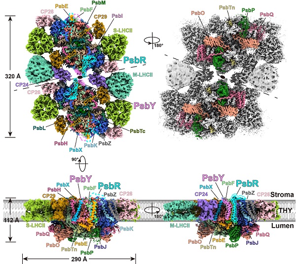 图1 菠菜I型PSII-LHCII大型复合物的冷冻电镜密度图。新发现的PsbR及PsbY亚基使用实线轮廓高亮标记,二者在外侧核心所对应的空缺结合位点用虚线轮廓来标记。