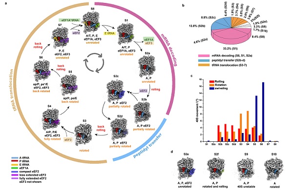 图1. 核糖体的主要构象和翻译的延伸周期,及对应小亚基的运动参数