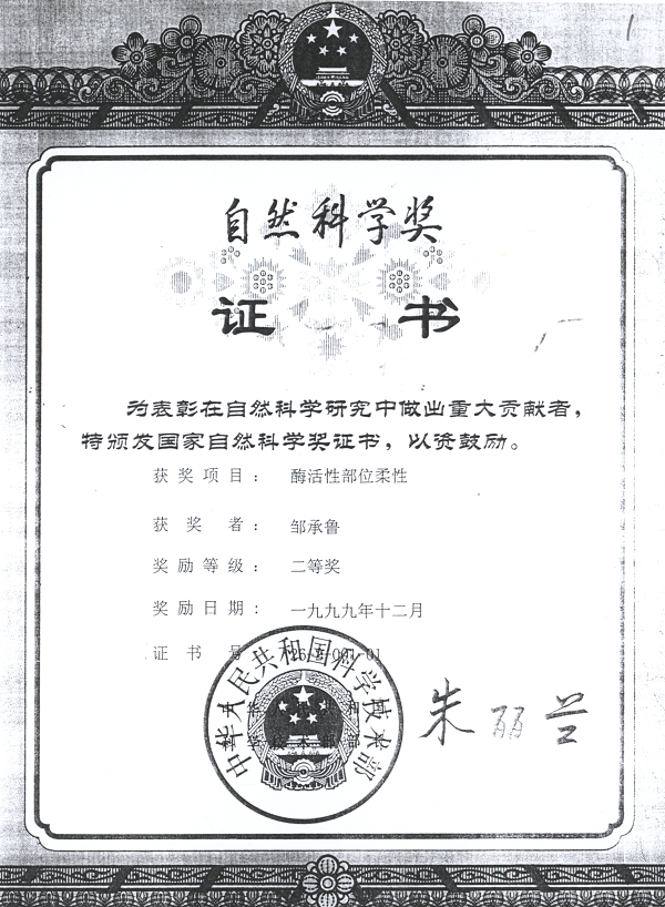 多年来蛋白质变性的大量研究常限于蛋白质分子的构象变化,很少把它与活性变化联系起来,其部分原因是由于缺少计算各种动力学常数的方法。邹承鲁和他的学生们用自己创立的不可逆抑制动力学理论研究了各种不同类型的酶在变性过程中构象和活力变化的关系,得到活性丧失先于构象变化的结果,提出了酶活性部位柔性的假说。十余年间实验数据的积累充分支持酶活性部位柔性的学说。世界各国有十几个实验室随后开展的研究进一步支持酶活性部位柔性学说。邹承鲁把蛋白质变性研究从单纯的结构研究推向与功能密切结合的新水平,是酶作用机制研究的重大进展,对此工作的总结发表在美国Science杂志。研究成果获国家自然科学奖二等奖。