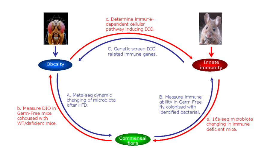 2. 高热量/脂肪饮食(WTD)导致体重增加和肥胖(DIO)与肠道菌群-肠道免疫互作有关,但免疫应答与调控规律不详。我们拟利用果蝇和肠道免疫缺陷小鼠两种模型各自的优势,联合研究DIO过程中(1)肠道菌群稳态以及能量和脂肪代谢变化规律;(2)影响肠道菌微生态和宿主能量与脂肪代谢的免疫调节机制,以期确定肠道粘膜免疫、肠道菌群和肥胖症之间的网络调控关系,揭示DIO的肠道生态免疫学应答与调控的分子与细胞机制。