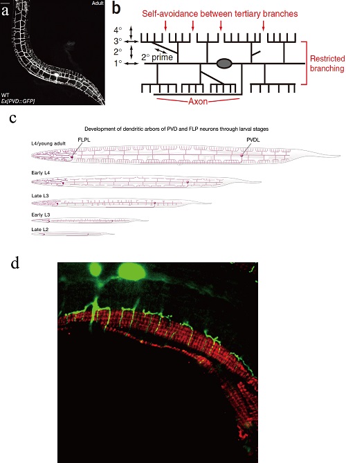 树突是神经细胞突起的一种,负责接收来自于其他细胞的信号并将其传递给胞体,在神经系统信息交流及神经环路的形成中具有重要作用。尽管研究发现了一些调控树突发育的基因,然而对树突形态发生的分子机制的认识依然匮乏。PVD作为线虫中感受伤害性和低温刺激的神经元,具有与高等哺乳动物感觉神经系统类似的多级分支树突结构,为树突形态发育的分子机制研究提供了良好的模型。我们实验室以PVD树突为研究对象,通过遗传学、细胞生物学、分子生物学、生物化学等手段研究树突发育、维持机制。
