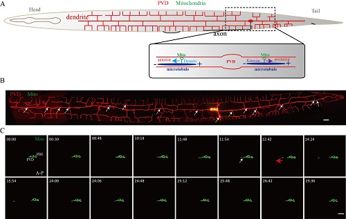 图2:(A)线虫PVD神经元整体形态示意图,其中放大部分为PVD胞体和向前、向后发出的树突,前面树突和后面树突中微管的极性在图中也标出。动力蛋白负责向前运输线粒体,而驱动蛋白负责向后运输线粒体。