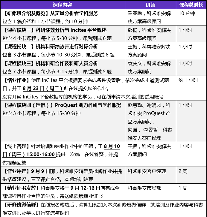 欢迎您参加2022年7月18日至9月9日由科睿唯安组织的"学科服务初级研修班--2022暑期线上训练营"活动,本次活动免费举行。研修班面向图书馆学科服务负责人及科研管理人员,通过在线观看系列培训课程、完成课后小测试及结业作业等方式,帮助学员建立运用数据分析为学科战略规划和学科服务提供支撑的基本能力。在规定时间内完成所有课程学习、测试和作业项目的学员将获得结业证书,请您于7月29日前报名参加活动。