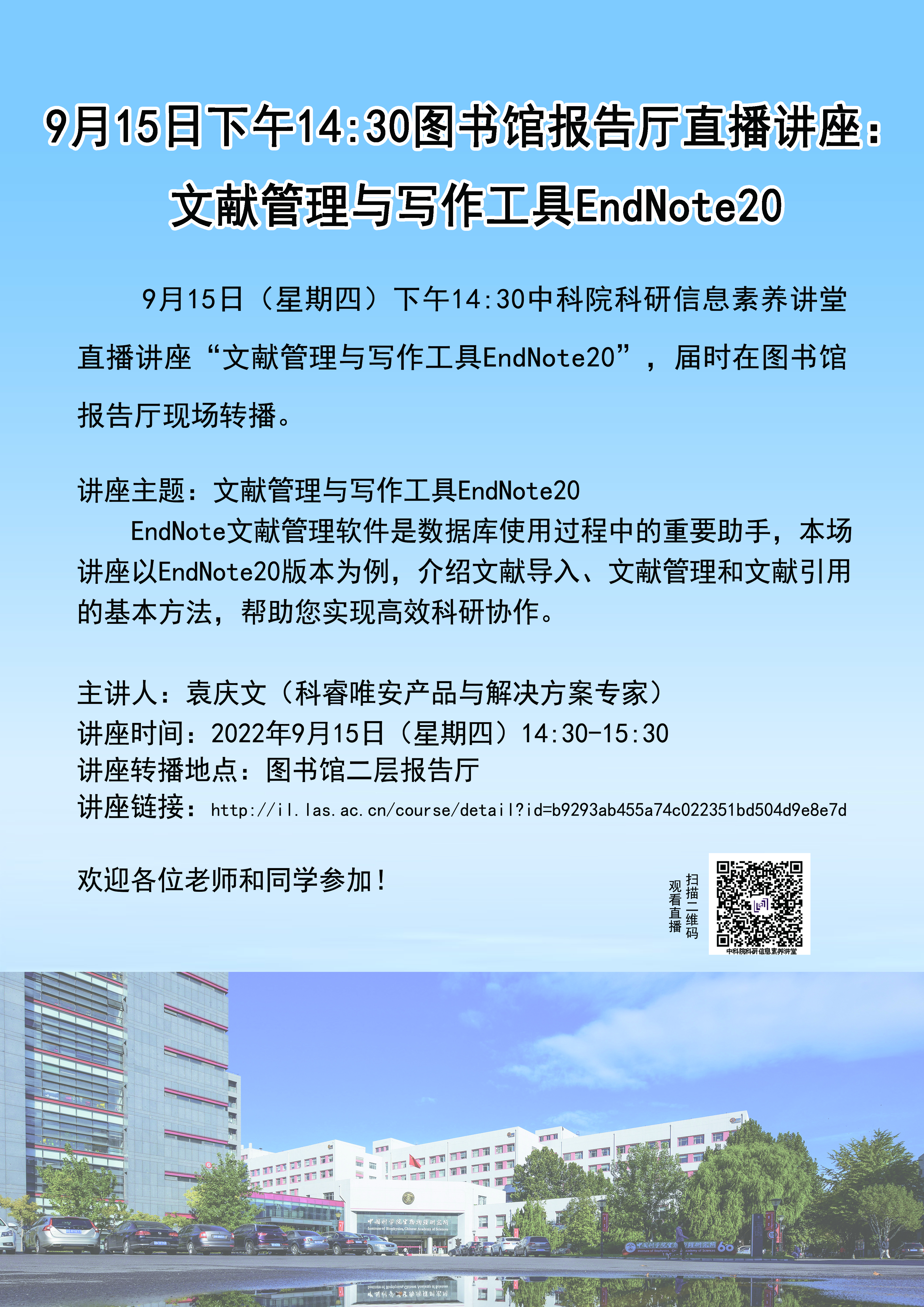 9月15日(星期四)下午14:30中科院科研信息素养讲堂直播讲座"文献管理与写作工具EndNote20",由科睿唯安产品与解决方案专家袁庆文主讲。