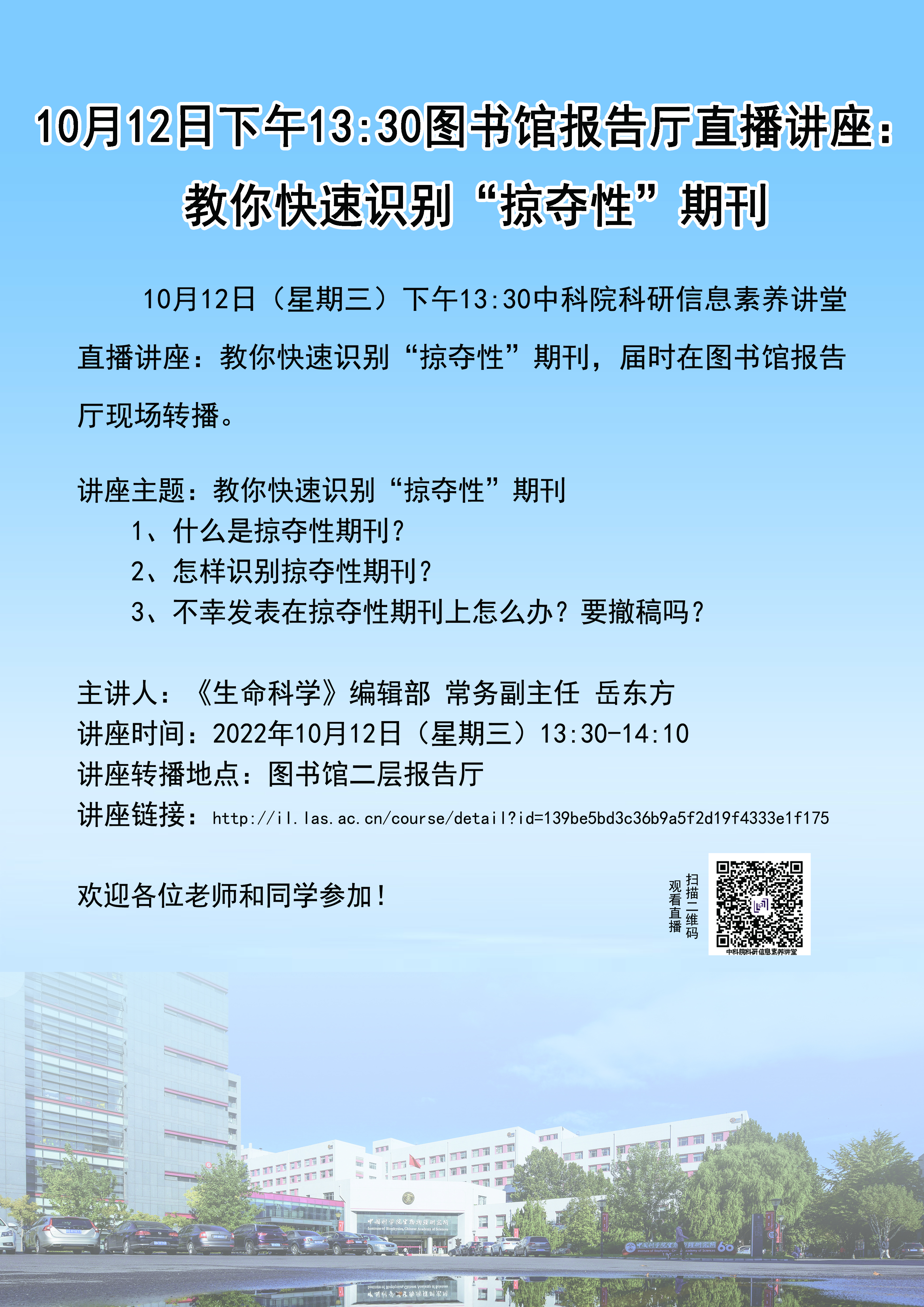 10月12日(星期三)下午13:30中科院科研信息素养讲堂直播讲座:教你快速识别"掠夺性"期刊,由《生命科学》编辑部常务副主任岳东方主讲。