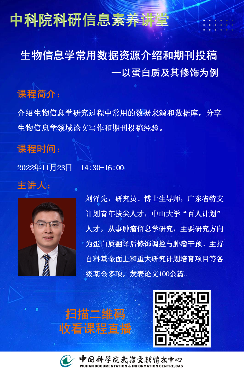 11月23日(星期三)下午14:30中科院科研信息素养讲堂直播讲座:生物信息学常用数据资源介绍和期刊投稿—以蛋白质及其修饰为例,由中山大学肿瘤防治中心刘泽先研究员主讲。