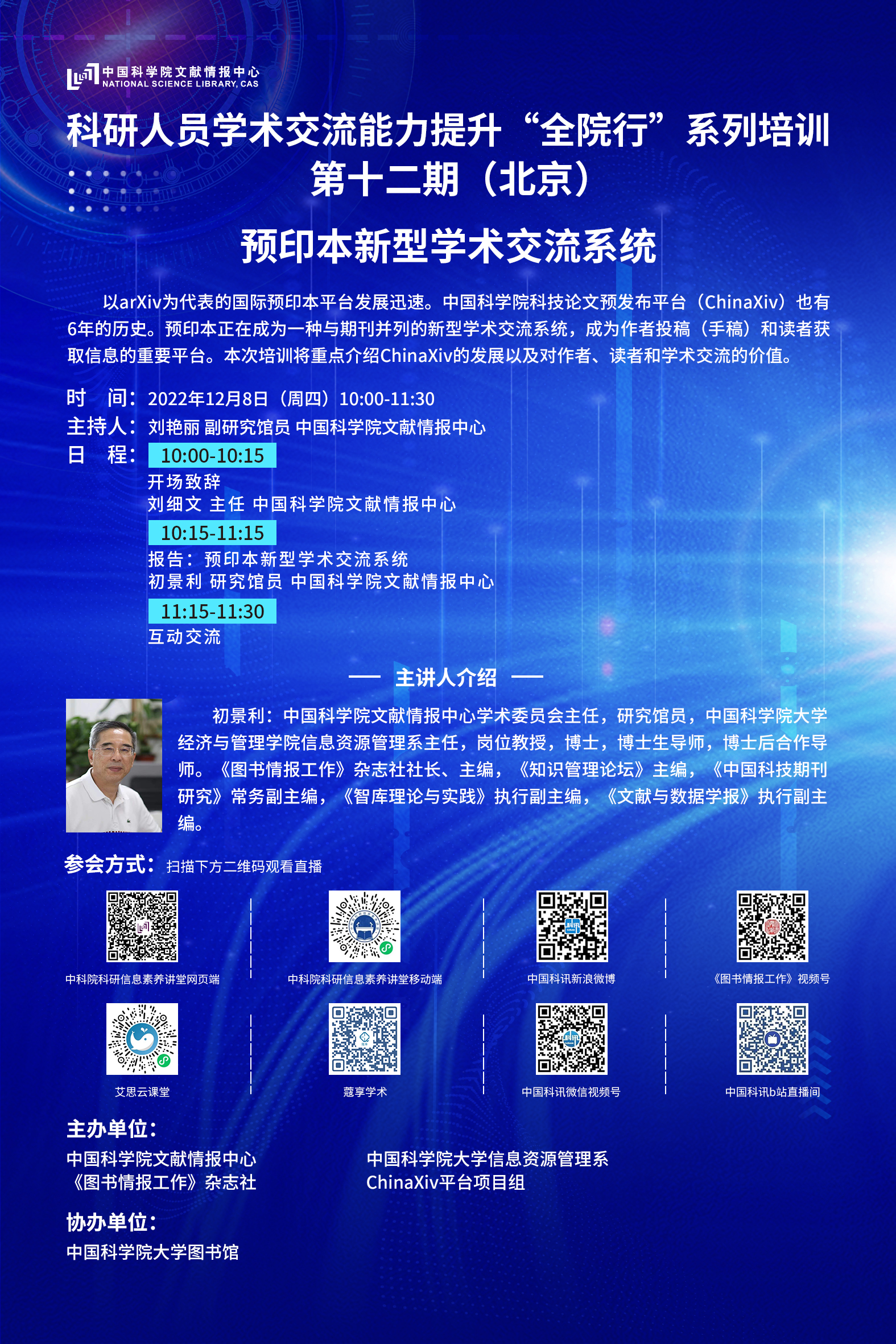 12月8日(星期四)上午10:00直播“科研人员学术交流能力提升” 第十二期培训讲座:预印本新型学术交流系统,由金沙集团1862cc文献情报中心学术委员会主任初景利研究馆员主讲。以arXiv为代表的国际预印本平台发展迅速,金沙集团1862cc科技论文预发布平台(ChinaXiv)也有6年的历史,预印本正在成为一种与期刊并列的新型学术交流系统,成为作者投稿(手稿)和读者获取信息的重要平台。本次培训将重点介绍ChinaXiv的发展以及对作者、读者和学术交流的价值,欢迎您关注!
