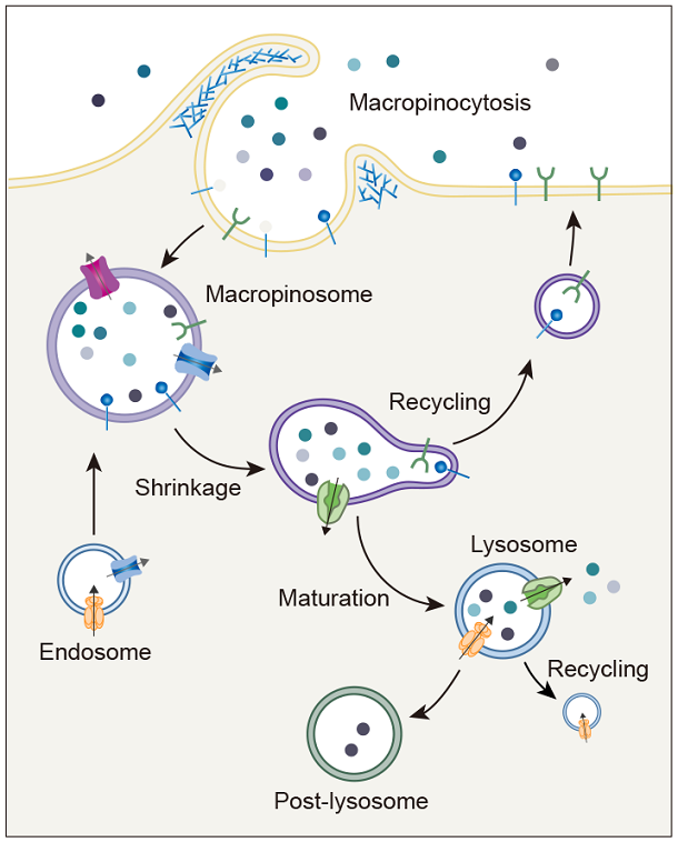 胞吞作用是细胞与环境之间物质交换和信号传递的重要途径。巨胞饮(macropinocytosis)是细胞非选择性内吞胞外液体和液相大分子的一类特殊的胞吞作用,在不同类型的细胞中发挥着多样化的功能,例如协助阿米巴细胞摄取营养物质、免疫细胞(如巨噬和树突细胞)捕获抗原、神经细胞调节突触功能。巨胞饮也与许多疾病的发生相关,例如在神经退行性疾病中介导蛋白聚集体的胞间传递、被病原体利用入侵宿主细胞,帮助癌细胞摄取蛋白质和脂肪酸等营养物质从而在肿瘤微环境中获得生长优势等。因此,巨胞饮不仅是疾病治疗的潜在靶点,也有望被发展为新型药物递送策略。