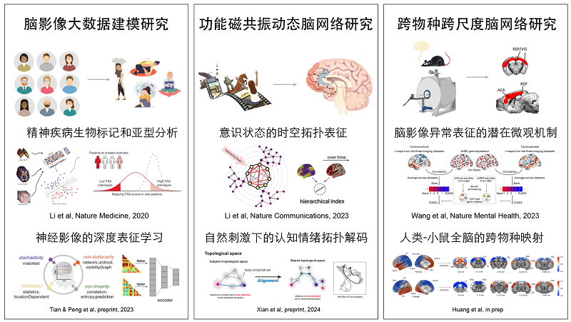 抑郁症、精神分裂症、自闭症等精神疾病的病因不明,缺乏个体化的定量生物标记以帮助精准诊疗。针对这一挑战,实验室致力于利用脑成像、人工智能、计算拓扑等多学科交叉方法,以人类和小鼠为研究对象,发展精神疾病定量的脑影像诊疗评估体系: