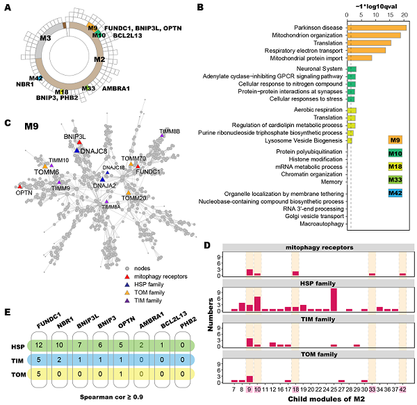 研究人员通过生物信息学分析、结合细胞模型和果蝇模型系统地研究了线粒体自噬受体FUNDC1调节TDP-43蛋白质稳态的分子机制。对GEO数据库中TDP-43蛋白病RNA-seq数据进行相关性分析和共表达网络构建,发现线粒体自噬受体基因FUNDC1与TDP-43以及HSP70/HSP40/TOM家族的多个成员存在共表达关系(图1)。在细胞模型中,尽管FUNDC1与TDP-43没有直接的蛋白-蛋白相互作用,但是过表达TDP-43会增加FUNDC1的水平,且FUNDC1促进TDP-43的线粒体定位。生化实验表明,FUNDC1和TDP-43可分别与TOM70、HSPA8和DNAJA2相互作用,而且后三种蛋白与TDP-43的线粒体输入密切相关。进一步实验证明,FUNDC1通过促进TDP-43-TOM70和DNAJA2-TOM70的相互作用来增加TDP-43的线粒体定位,且此效应独立于FUNDC1的LC3相互作用区域LIR。在TDP-43蛋白病转基因果蝇模型中,过表达FUNDC1会增强TDP-43诱导的线粒体损伤,而下调FUNDC1可部分挽救TDP-43诱导的线粒体损伤。在类神经元细胞SH-SY5Y中,过表达FUNDC1通过增加线粒体蛋白酶LONP1水平和激活线粒体自噬来调节细胞质中TDP-43的蛋白水平。总之,FUNDC1通过调节与线粒体蛋白输入途径相关的蛋白质机器促进TDP-43的线粒体输入,且FUNDC1介导的线粒体质量控制在TDP-43蛋白的稳态调控中发挥重要作用(图2)。