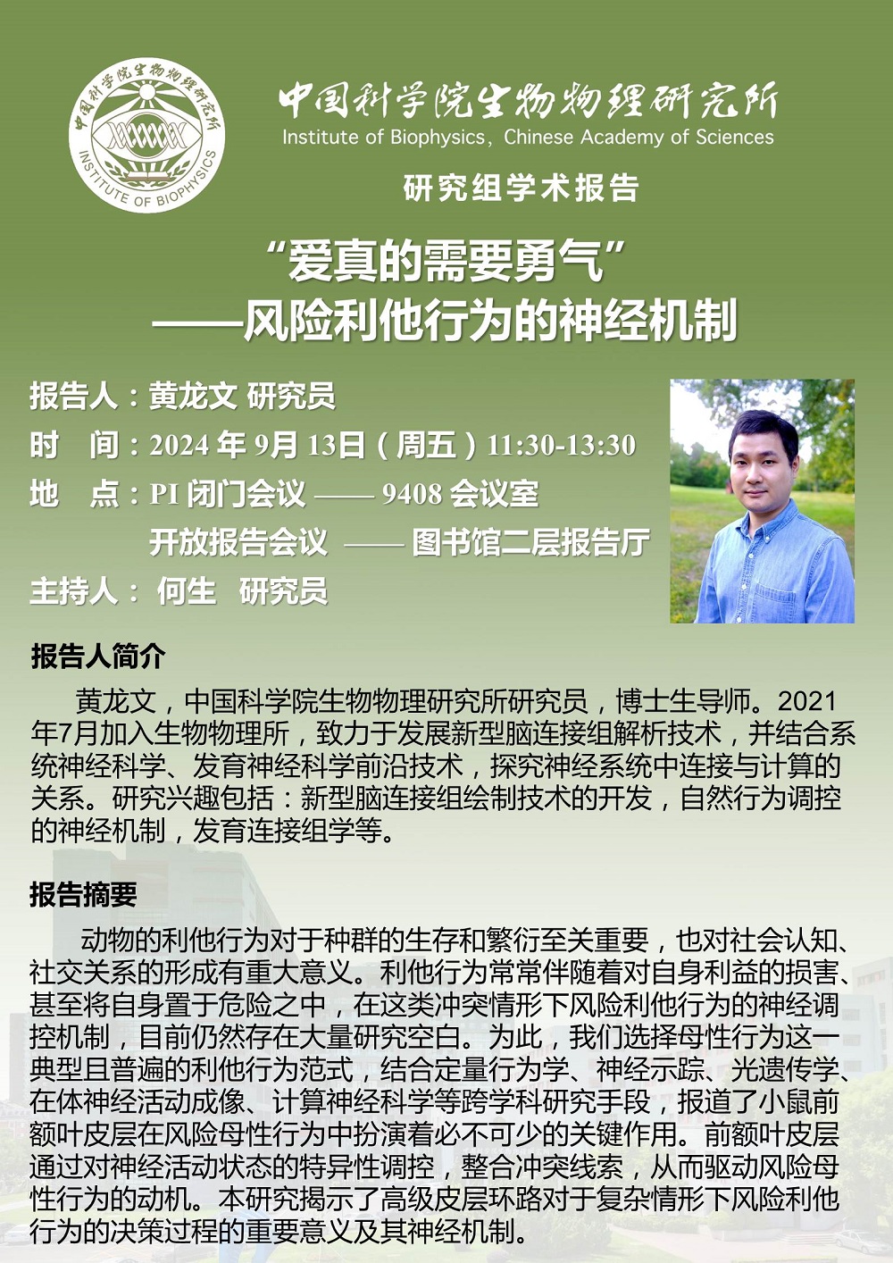 2024年9月13日中午11:30 研究组学术报告:“爱真的需要勇气”——风险利他行为的神经机制