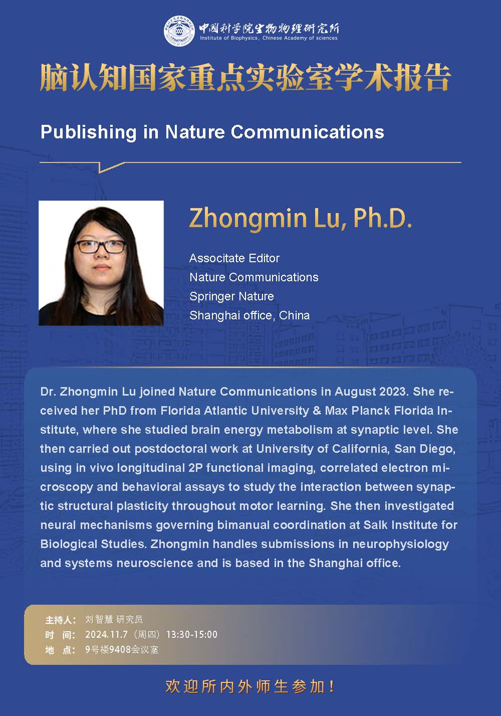 2024年11月7日下午13:30 脑与认知科学重点实验室学术报告:Publishing in Nature communications