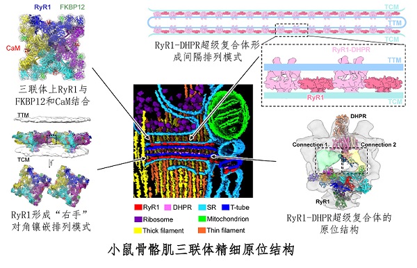 在生物体内,骨骼肌的收缩与舒张是受神经系统控制的。神经系统传递来的化学信号经过一系列的转变与传递过程最后形成肌肉的机械收缩行为,这个过程被称为兴奋-收缩偶联。在骨骼肌中,肌细胞的细胞膜会内陷形成长而窄的膜性细管--横管,而横管通常会被两侧的终池夹在中间形成一种特殊的紧密结构称为三联体。在兴奋-收缩偶联过程中,横管膜上的二氢吡啶受体(dihydropyridine receptors,DHPR)负责感受沿着横管传递到肌细胞深处的电兴奋,并将信号传递给肌浆网膜上的钙离子通道蛋白--1型兰尼碱受体(ryanodine receptors type 1,RyR1),继而由RyR1释放出肌浆网中储存的钙离子;之后,钙离子会充当信号调控粗、细肌丝之间的相对滑动,引起肌肉的收缩与舒张。由此可知,三联体上的RyR1是整个兴奋-收缩偶联过程中传递兴奋信号的重要元件。2015年,颜宁研究组、施一公研究组与英国MRC的Sjors Scheres研究组合作,成功解析了兔源RyR1蛋白与其抑制蛋白FK506结合蛋白12(FKBP12)的复合体的3.8 Å高分辨率三维结构。2016年,北京大学基础医学部的尹长城研究组和孙飞研究组合作,在RyR1关闭态的基础上解析了钙离子激活的RyR1开放态4.2 Å分辨率的结构。然而,尽管 RyR1的高分辨率结构已经被解析,仍有一系列关于 RyR1功能的重要科学问题未被解决,包括 RyR1 在肌肉组织三联体中如何分布、如何发挥上下游信号传递作用、如何产生信号的协同效应等。尤其是关于RyR1与DHPR之间的作用方式,尽管研究者推测骨骼肌中的RyR1与DHPR之间存在紧密、直接的物理偶联,但该假说目前仍然缺少直接性的证据。
