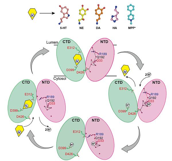 单胺类神经递质包括去甲肾上腺素、肾上腺素、多巴胺、血清素和组胺等,在神经系统和其他组织中发挥着重要的生理作用。其中,在神经系统中,去甲肾上腺素介导调节情绪,认知,疼痛等多种生理功能,同时它也影响大脑注意力和反应行为,诱发“战斗或逃跑”反应。多巴胺在调节运动和奖励方面发挥着重要作用,被认为与帕金森病和精神分裂症等精神疾病有关。而血清素则是"幸福感"的来源,同时也具有调节睡眠节律的作用。囊泡单胺转运蛋白(VMAT2)是中枢神经系统中唯一介导单胺类神经递质储存的转运蛋白。它利用质子的电化学势,以2:1的质子与底物的化学计量比,将神经递质或神经毒素MPP+转运进入囊泡中,在介导神经冲动传递和神经保护方面发挥着至关重要的作用。