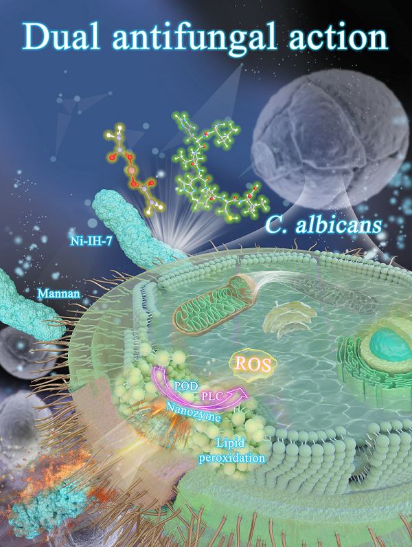 抗菌肽(Antimicrobial peptides,AMPs)和抗菌酶(Antimicrobial enzymes,AMEs)作为非常有前景的非抗生素类抗菌药物,具有特异杀菌、生物相容性高、绿色安全等优势,有望为解决微生物耐药难题提供新策略。然而,大多数抗菌肽杀菌效率不高,且稳定性较差,尤其是较长序列的抗菌肽不仅成本高,还容易引发免疫原性;类似的,抗菌酶通过催化破坏菌壁而杀菌,但是需要较长作用时间,而且作为天然蛋白酶容易失活,稳定性低,成本较高,且具有免疫原性。这些不足限制了抗菌肽和抗菌酶的实际应用。为了克服这些问题,金沙集团1862cc高利增研究组根据仿生原理,提出基于纳米酶模拟抗菌肽和抗菌酶的杀菌机制,设计开发双功能高效抗菌纳米酶。纳米酶是具有类酶催化活性的纳米材料,具有高稳定性、高活性、多功能、低成本等优势,是新一代人工模拟酶,有望在生物医学、农业等诸多领域的应用。高利增研究组前期发现多种具有氧化还原酶类活性的纳米酶能够模拟溶酶体杀菌原理,高效杀死多种耐药菌,其以细菌铁死亡为主的杀菌机制,显著区别于现有抗生素和其他抗菌材料,据此提出纳米酶抗生素(Nanozybiotics)新概念,有望为克服细菌耐药提供新策略(Advanced Materials 2024,2403362)。该研究从多肽纳米酶理性设计出发,基于抗菌肽和抗菌酶中活性部位的关键氨基酸包括组氨酸、半胱氨酸,结合多肽自组装和金属配位规律,利用Alphafold2、分子动力学模拟及密度泛函理论等多种计算机手段,优化筛选得到了一组IHIHICI的7肽序列,通过自组装形成纳米酶兼具AMPs和AMEs功能(AMPANs),展现出对真菌的特异高效杀菌作用。