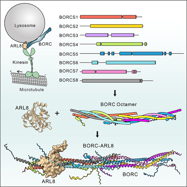 溶酶体的转运可通过小G蛋白ARL8控制,ARL8与马达蛋白直接或间接结合,并通过后者介导溶酶体沿微管轨道双向运输。有研究报道,ARL8主要通过异八聚体复合物BORC被特异性地募集至溶酶体膜上,即BORC作为适配因子或激活因子,招募ARL8进行调控溶酶体的转运和定位。此外,除调节溶酶体转运外,BORC-ARL8也是溶酶体-自噬体融合以及将新合成的蛋白质靶向溶酶体的过程中必需的调控因子,在控制突触囊泡的轴突转运中也至关重要。尽管BORC-ARL8在上述过程中发挥重要作用,但BORC的异八聚体组装及其与ARL8相互作用的分子机制目前尚不清楚。