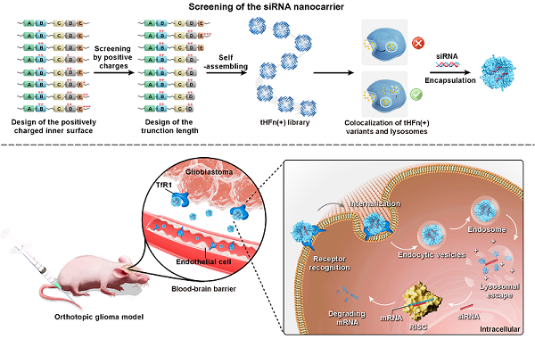 图:siRNA铁蛋白载体的设计、筛选及其在脑胶质瘤靶向治疗中应用的示意图