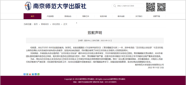 2022年9月13日,南京师范大学出版社网站上刊登《致歉声明》