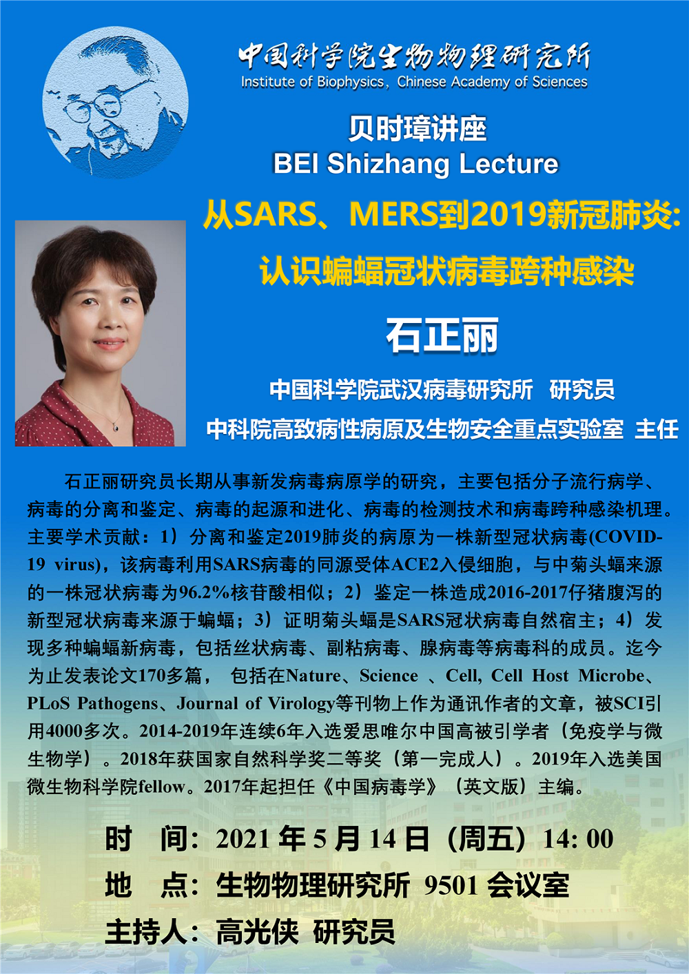 2021年5月14日下午14:00 贝时璋讲座报告:从SARS、MERS到2019新冠肺炎:认识蝙蝠冠状病毒跨种感染