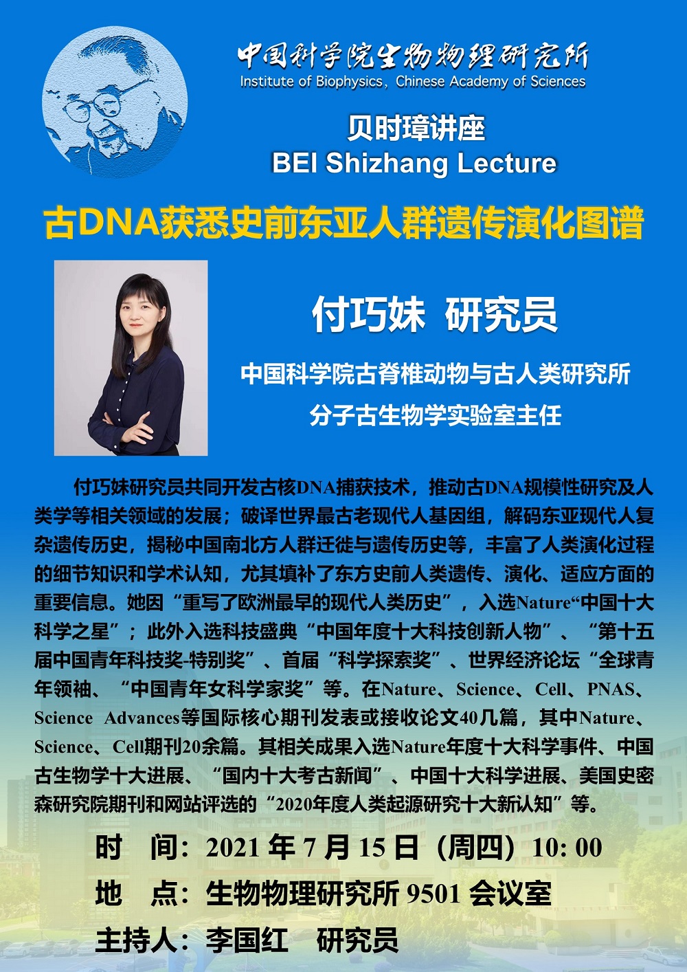 2021年7月15日上午10:00 贝时璋讲座报告:古DNA获悉史前东亚人群遗传演化图谱