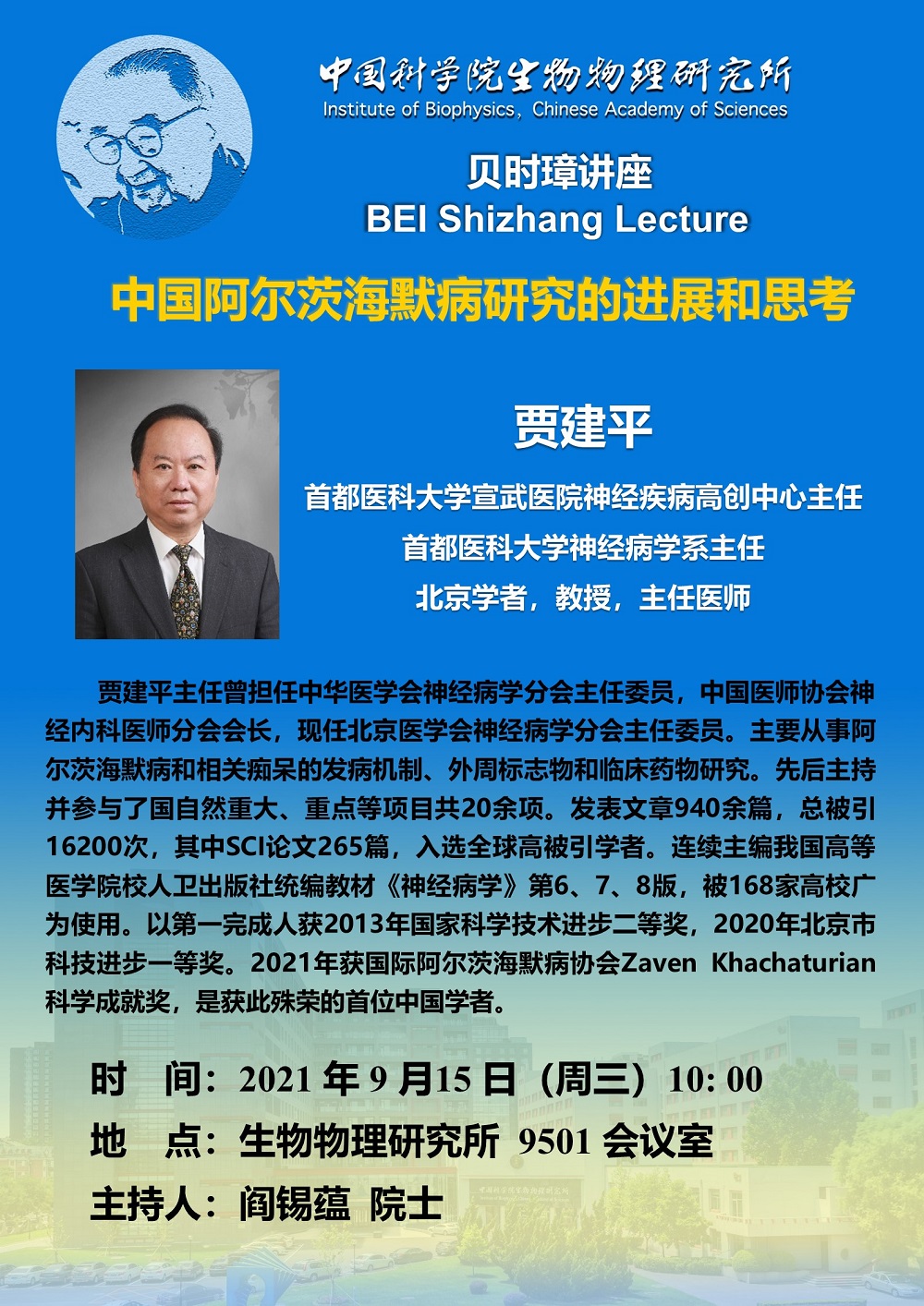 2021年9月15日上午10:00 贝时璋讲座报告:中国阿尔茨海默病研究的进展和思考