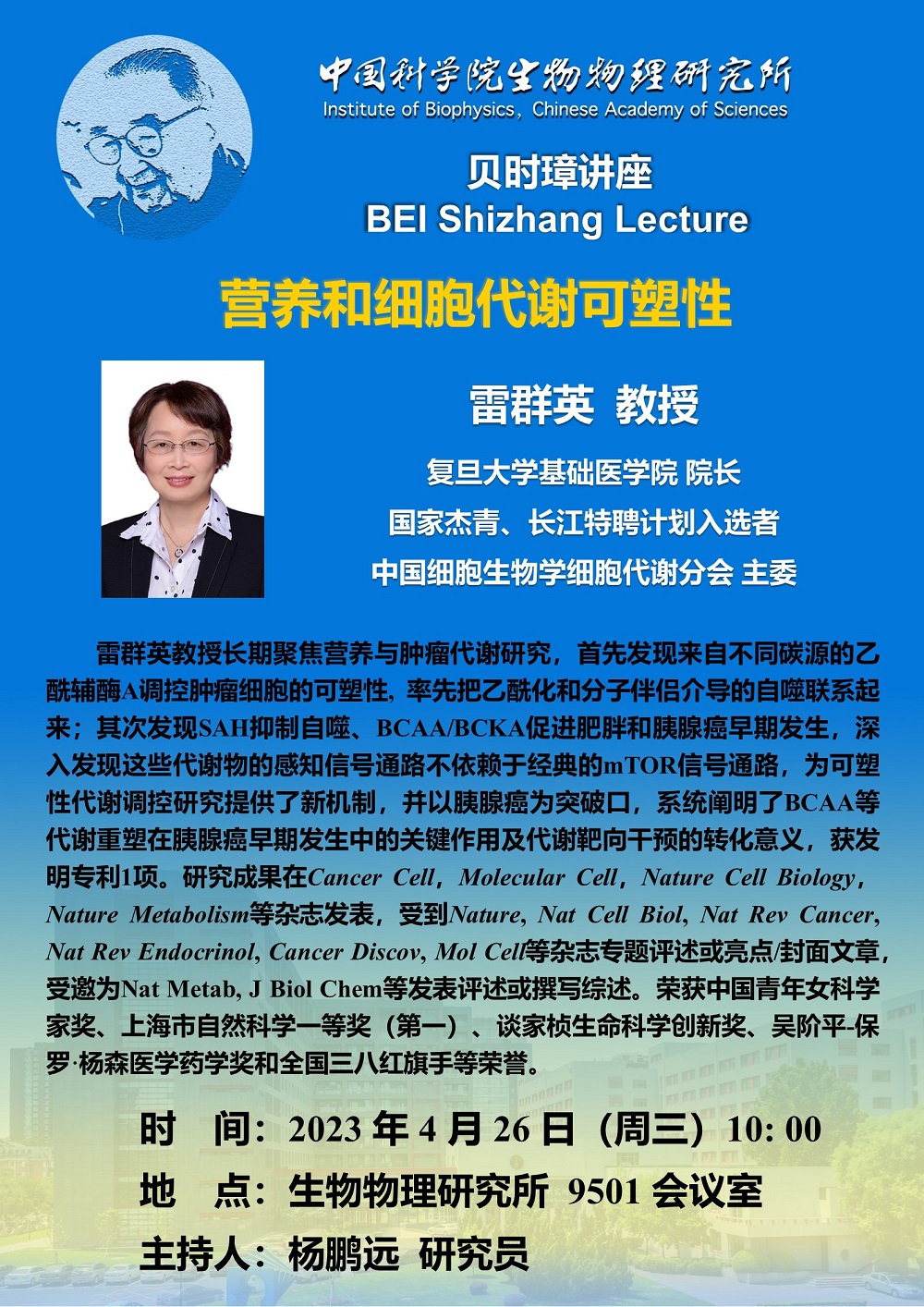 2023年4月26日上午10:00 贝时璋讲座报告:营养和细胞代谢可塑性