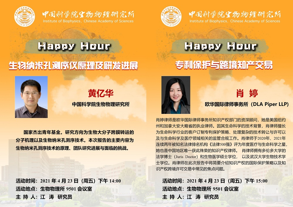 2021年4月23日下午14:00 Happy Hour:生物纳米孔测序仪原理及研发进展 & 专利保护与跨境知产交易