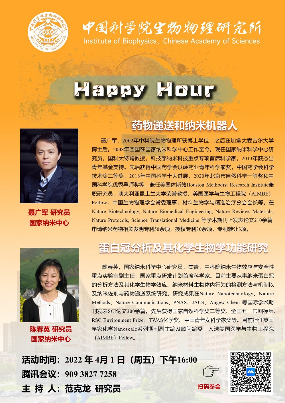 2022年4月1日下午16:00 Happy Hour:药物递送和纳米机器人 & 蛋白冠分析及其化学生物学功能研究