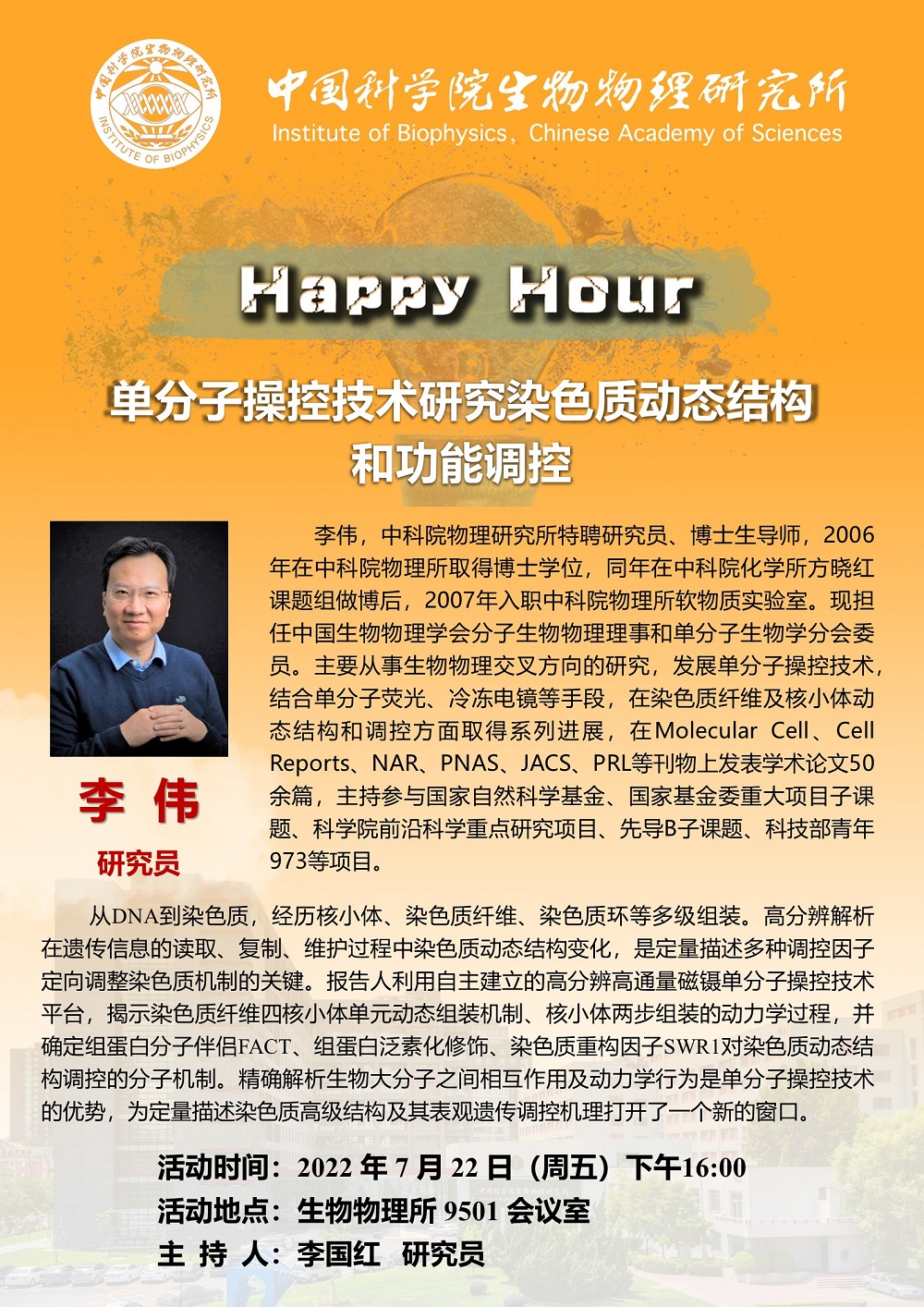 2022年7月22日下午16:00 Happy Hour:单分子操控技术研究染色质动态结构和功能调控