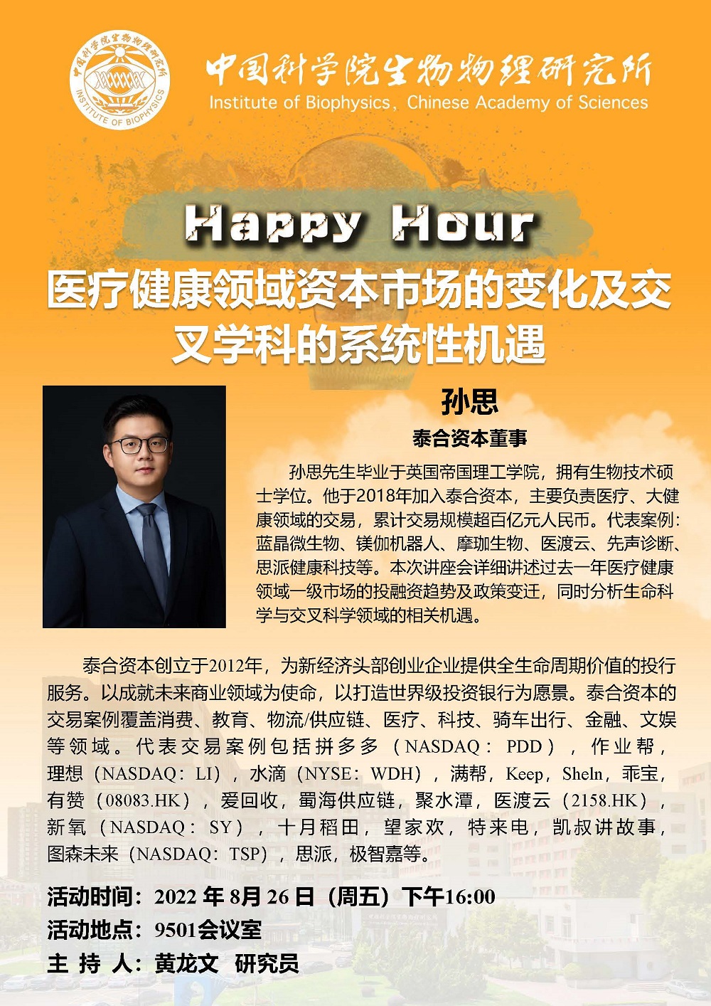 2022年8月26日下午16:00 Happy Hour:医疗健康领域资本市场的变化及交叉学科的系统性机遇