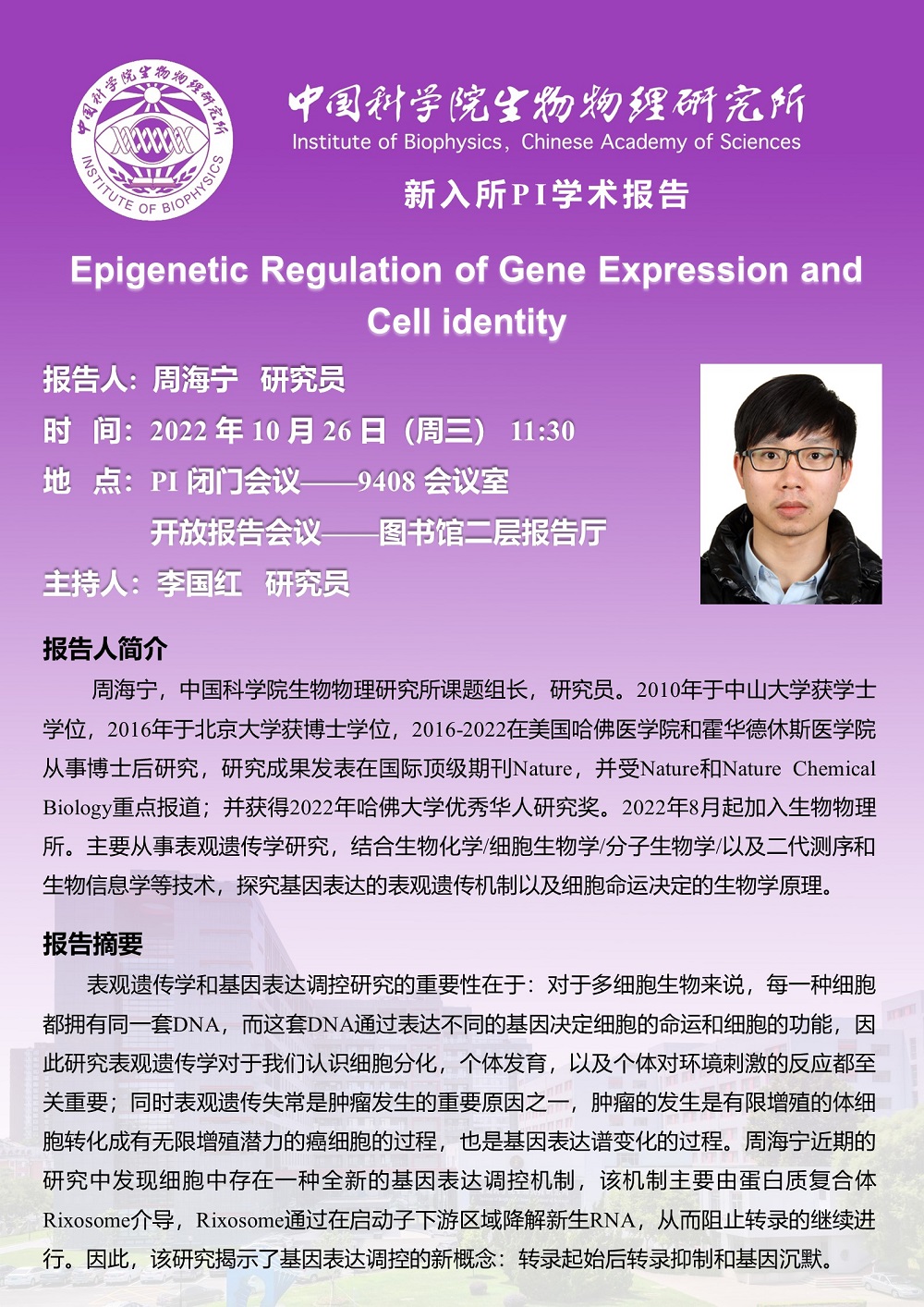2022年10月26日中午11:30 新入所 PI 学术报告:Epigenetic Regulation of Gene Expression and Cell Identity
