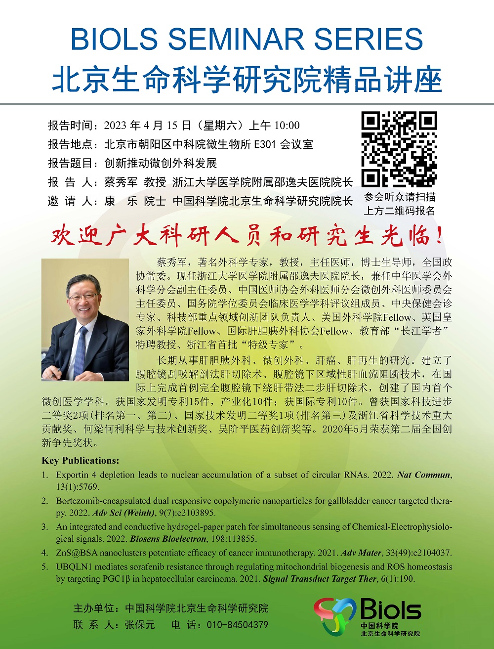 2023年4月15日上午10:00 北京生命科学研究院精品讲座:创新推动微创外科发展