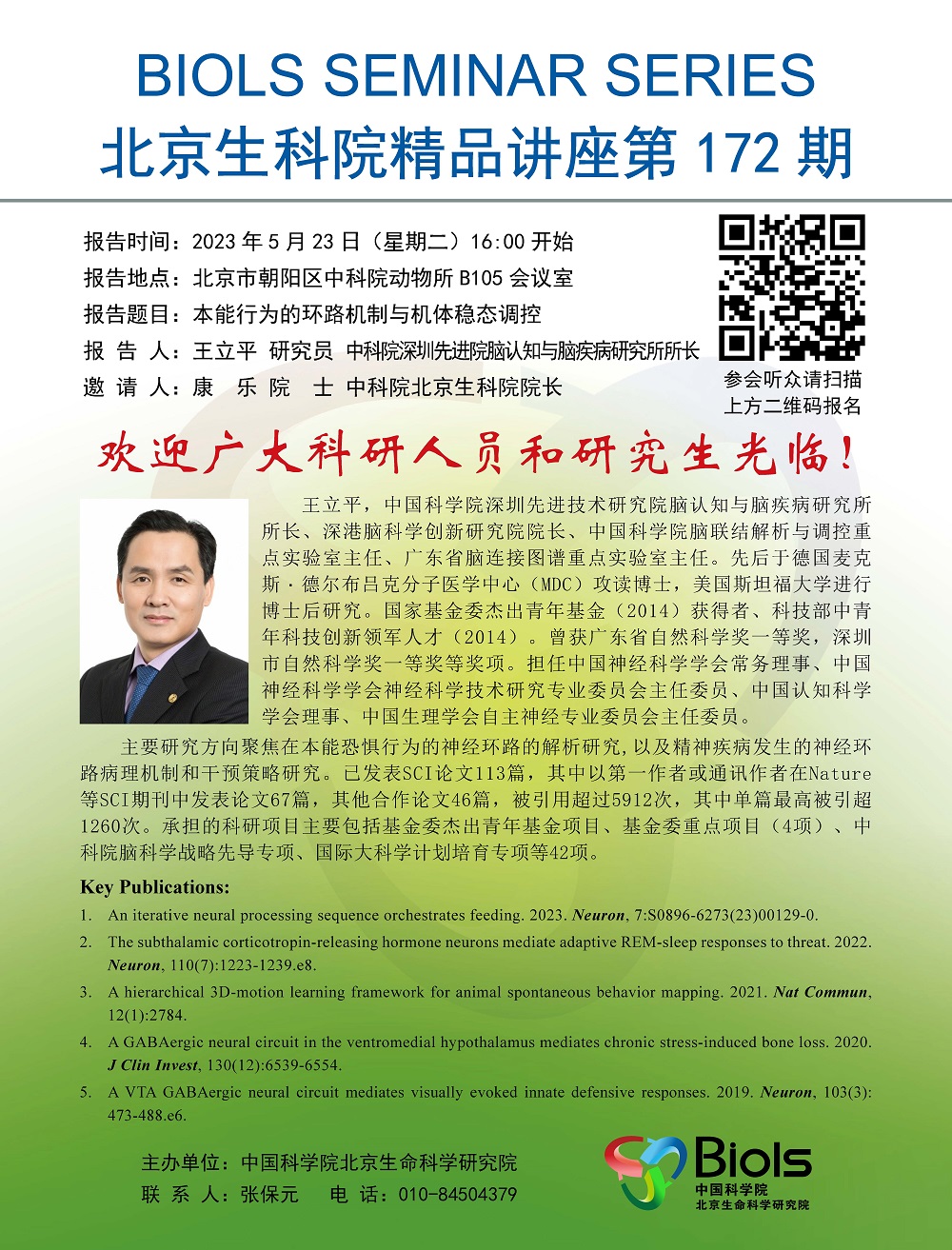 2023年5月23日下午16:00 北京生科院精品讲座:本能行为的环路机制与机体稳态调控