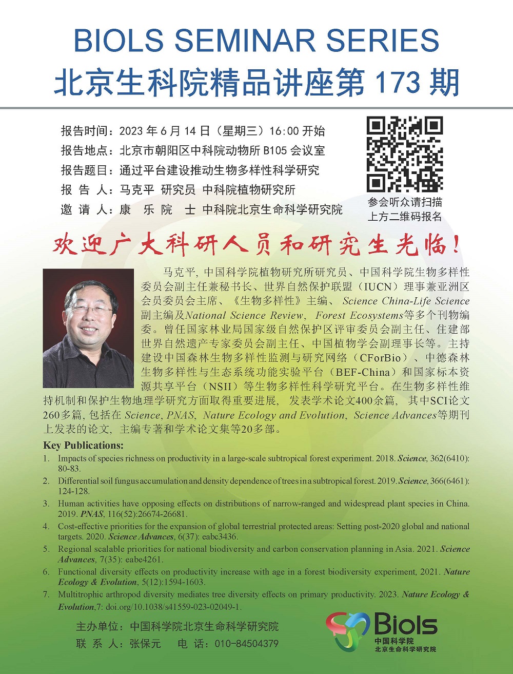 2023年6月14日下午16:00 北京生科院第173期精品讲座:通过平台建设推动生物多样性科学研究