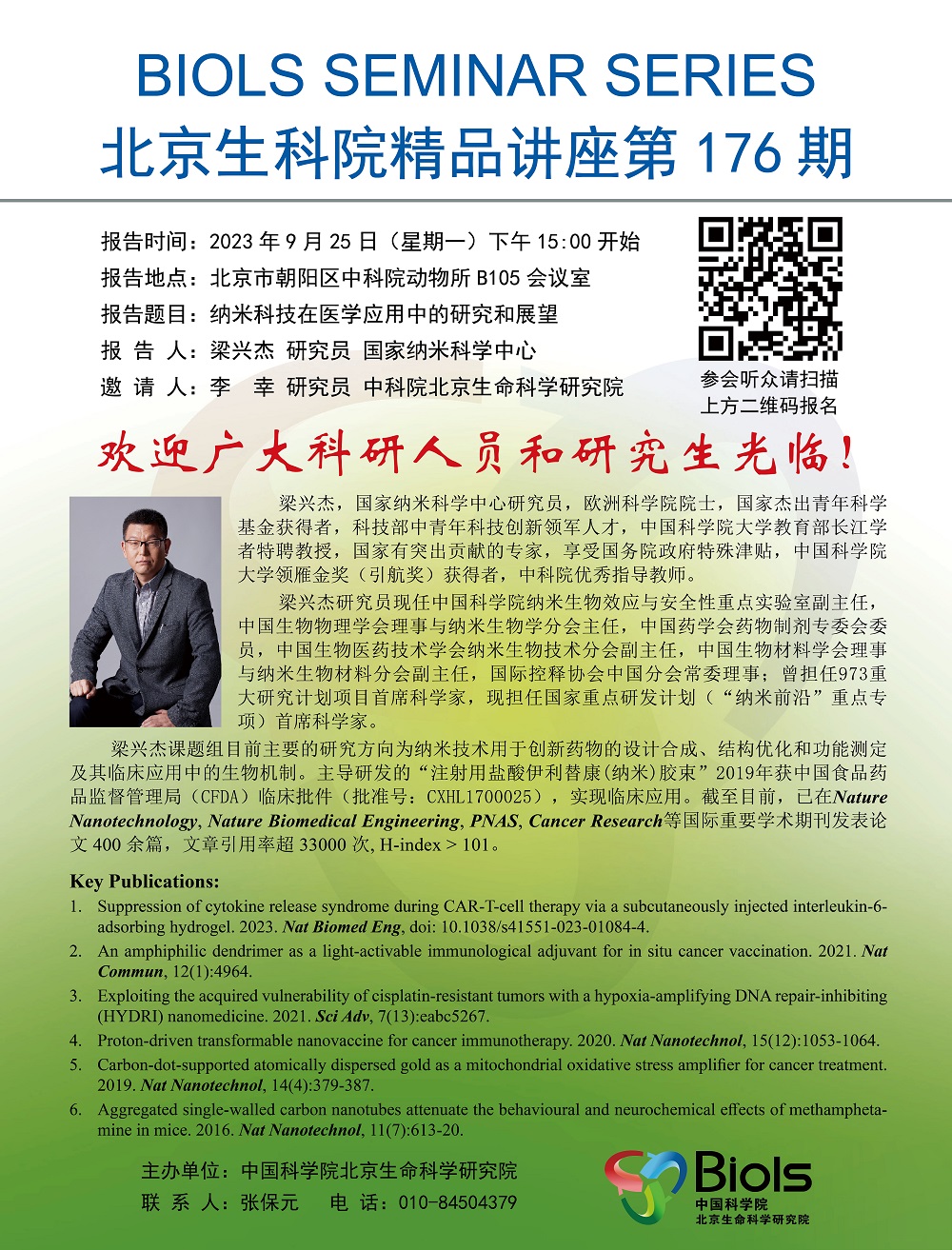 2023年9月25日下午15:00 北京生科院第176期精品讲座:纳米科技在医学应用中的研究和展望