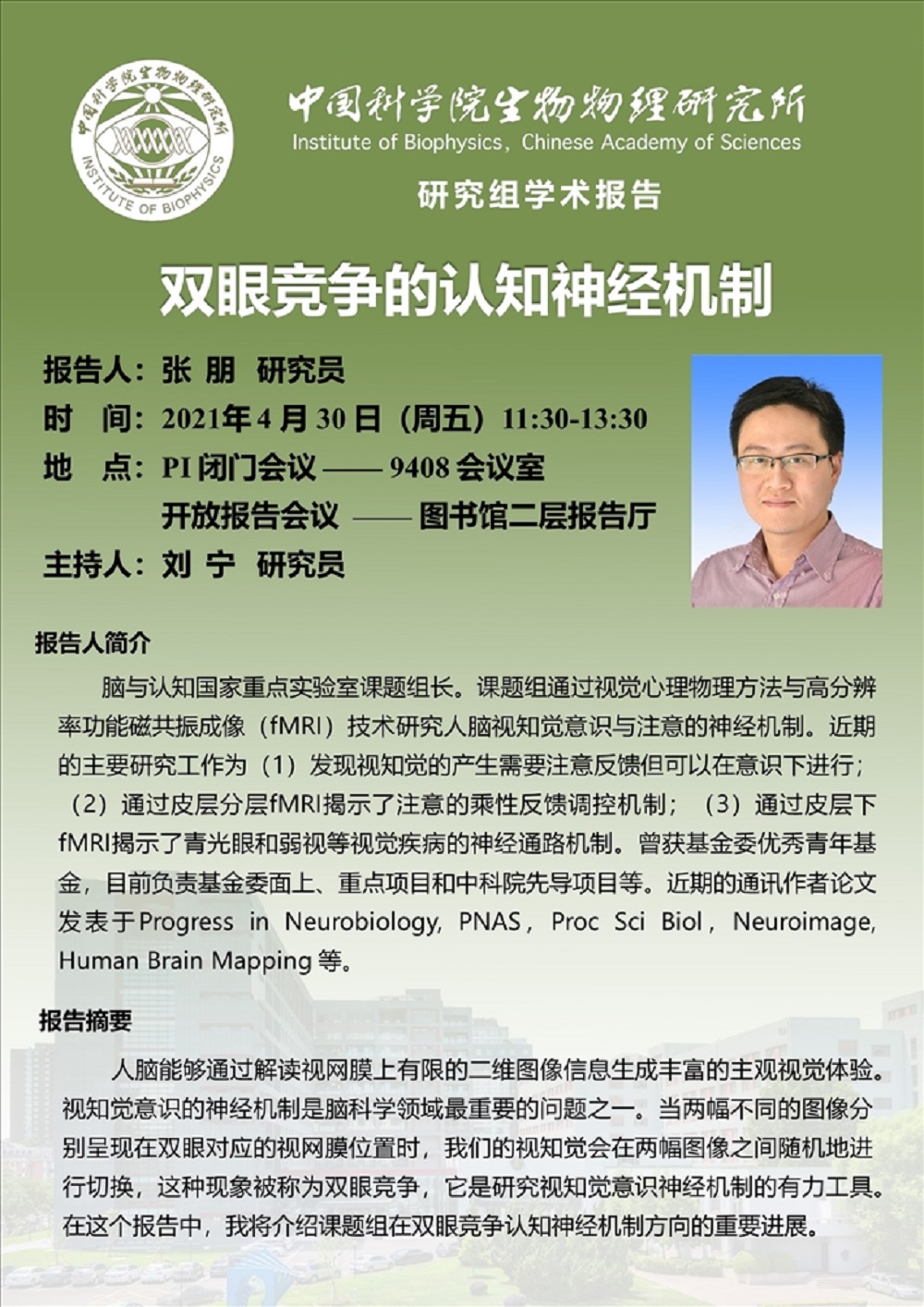 2021年4月30日上午11:30 研究组学术报告:双眼竞争的认知神经机制