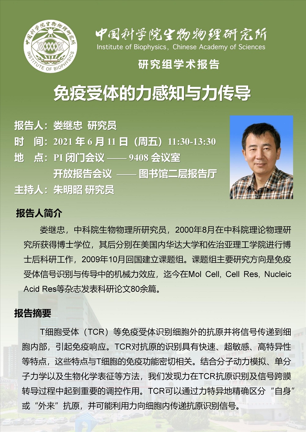 2021年6月11日上午11:30 研究组学术报告:免疫受体的力感知与力传导