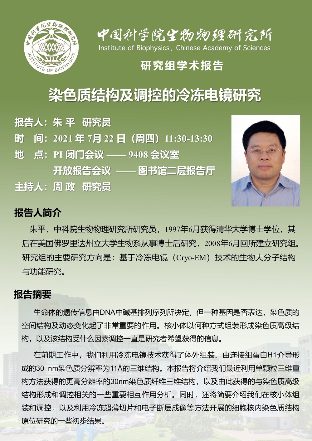 2021年7月22日中午11:30 研究组学术报告:染色质结构及调控的冷冻电镜研究