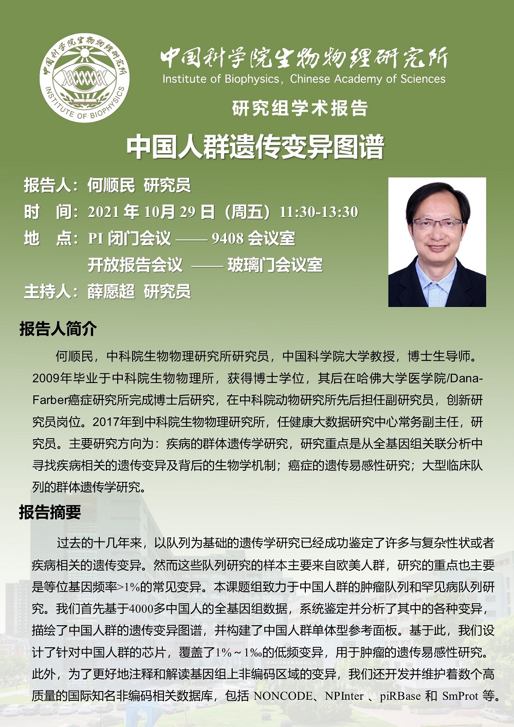 2021年10月29日中午11:30 研究组学术报告:中国人群遗传变异图谱