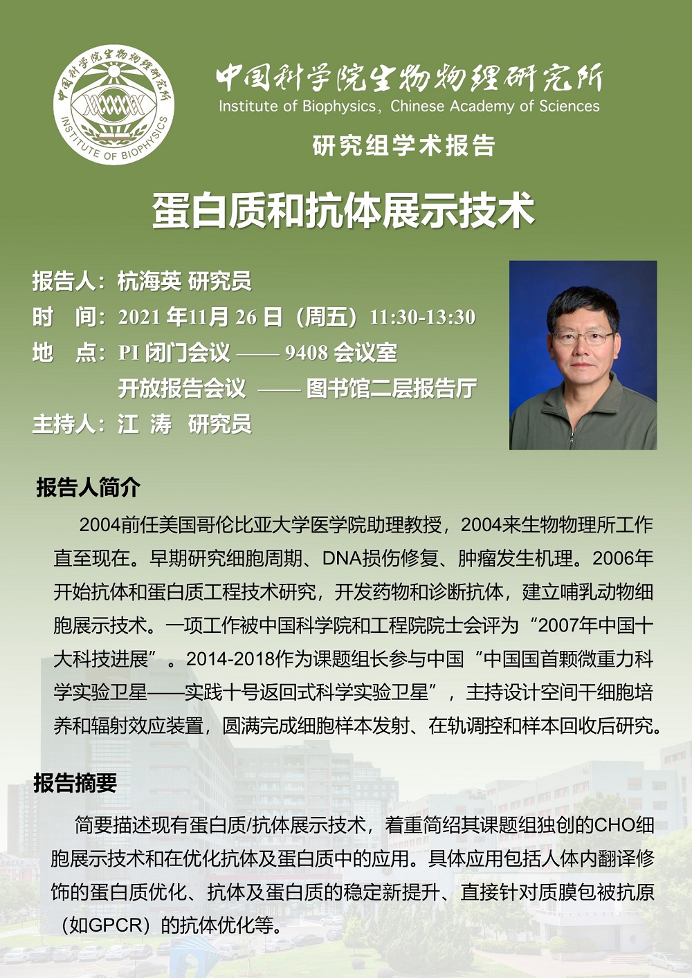 2021年11月26日中午11:30 研究组学术报告:蛋白质和抗体展示技术