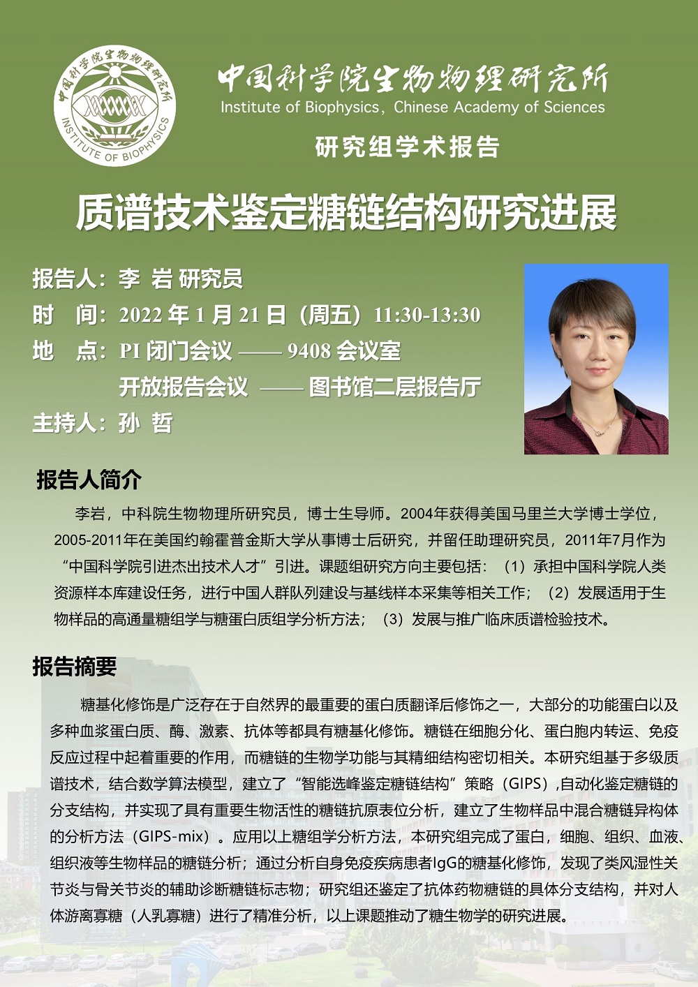 2022年1月21日中午11:30 研究组学术报告:质谱技术鉴定糖链结构研究进展