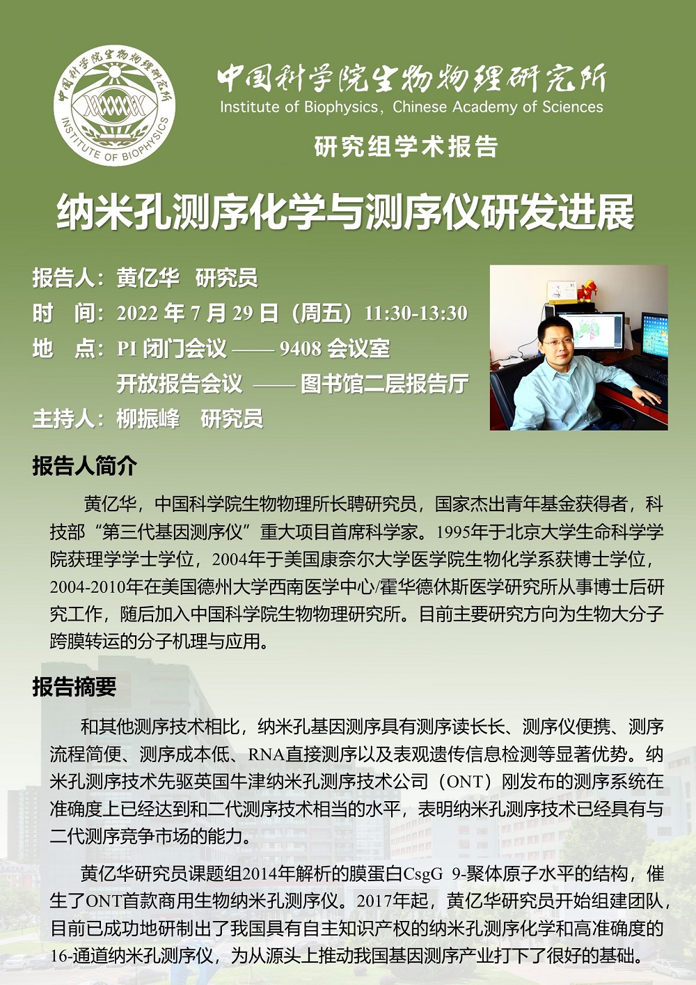 2022年7月29日中午11:30 研究组学术报告:纳米孔测序化学与测序仪研发进展