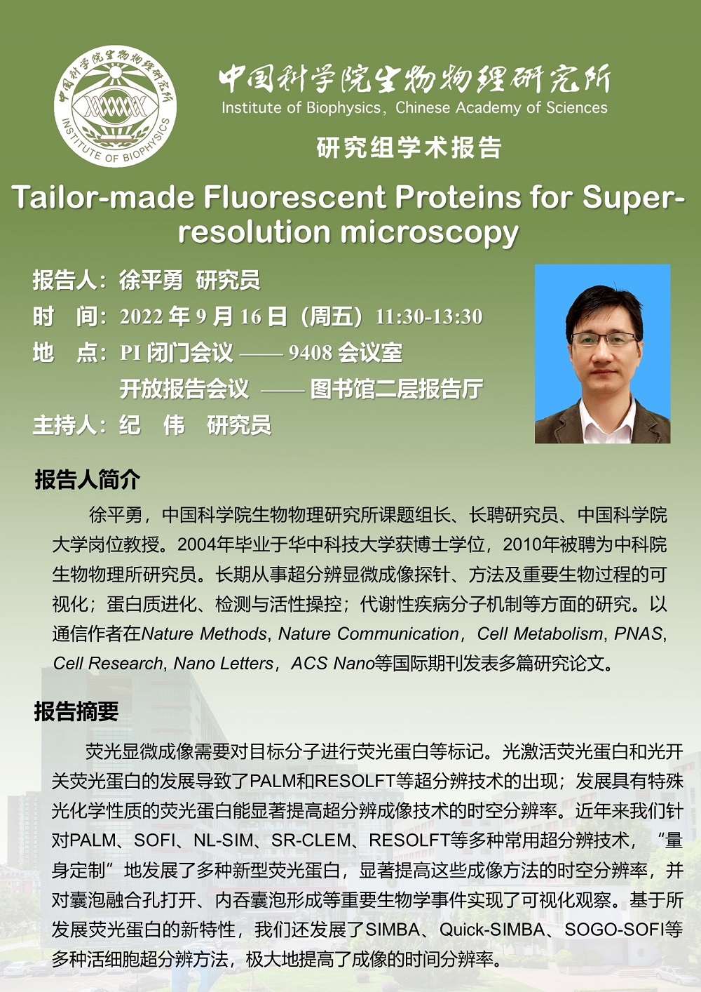 2022年9月16日中午11:30 研究组学术报告:Tailor-made Fluorescent Proteins for Super-resolution microscopy
