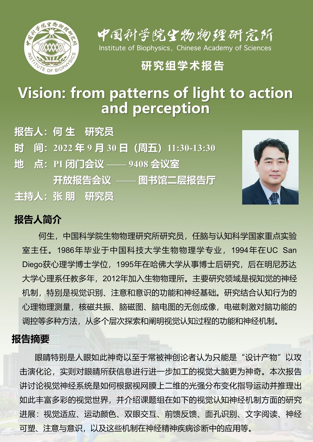 2022年9月30日中午11:30 研究组学术报告:Vision: from patterns of light to action and perception