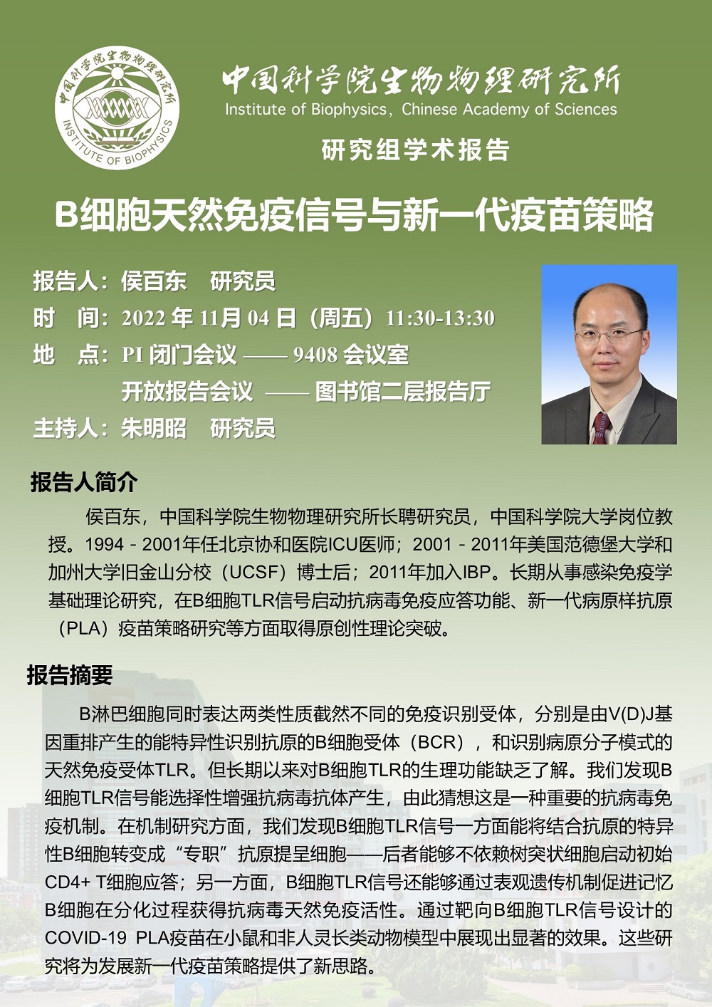 2022年11月4日中午11:30 研究组学术报告:B细胞天然免疫信号与新一代疫苗策略