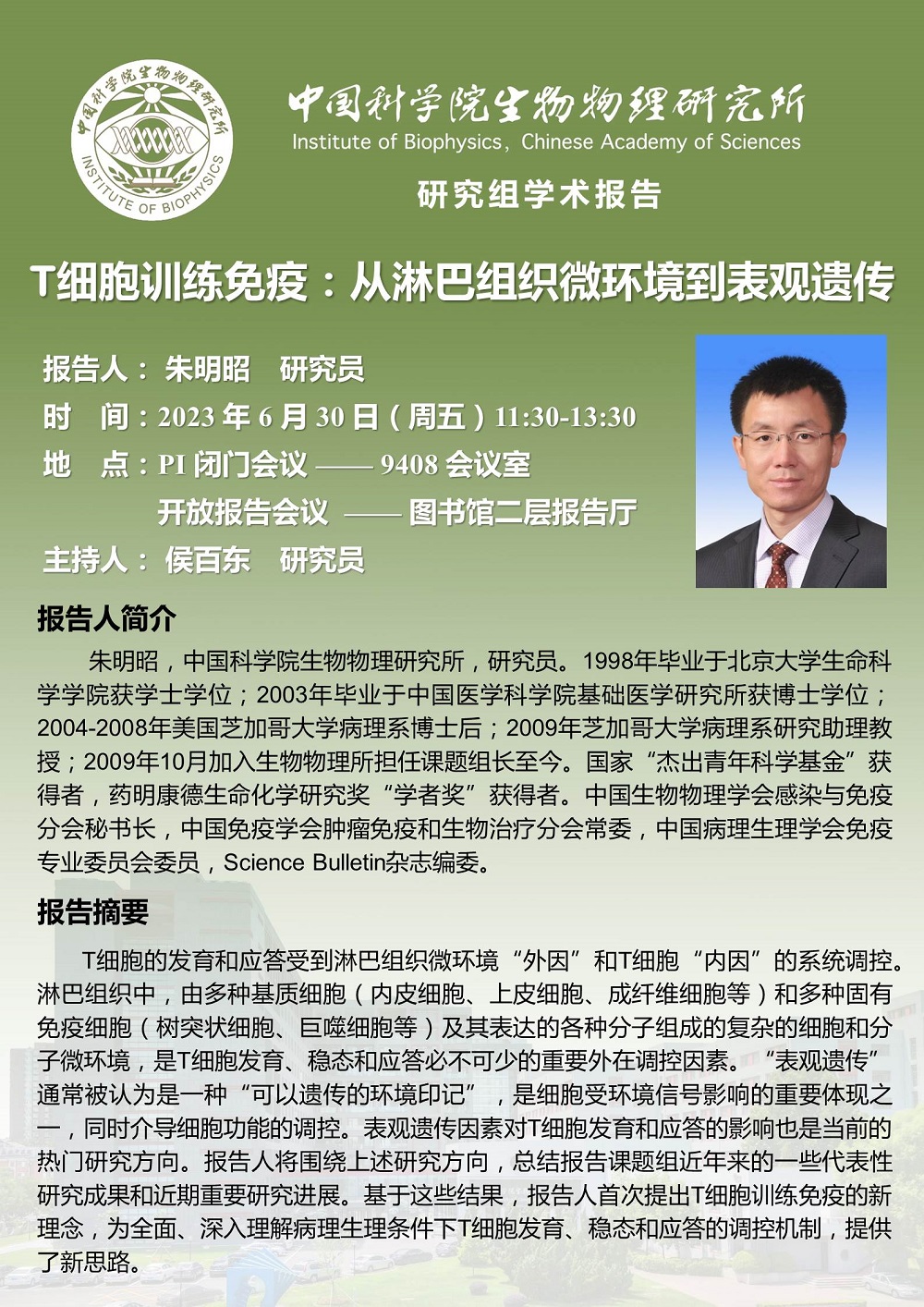 2023年6月30日中午11:30 研究组学术报告:T细胞训练免疫:从淋巴组织微环境到表观遗传