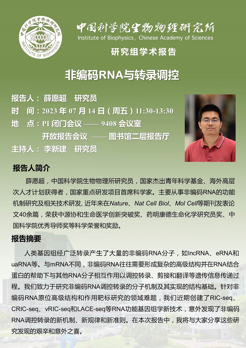 2023年7月14日中午11:30 研究组学术报告:非编码RNA与转录调控