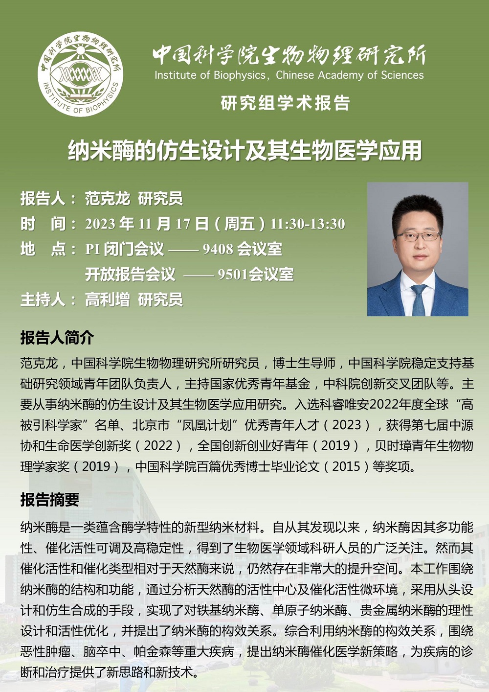 2023年11月17日中午11:30 研究组学术报告:纳米酶的仿生设计及其生物医学应用