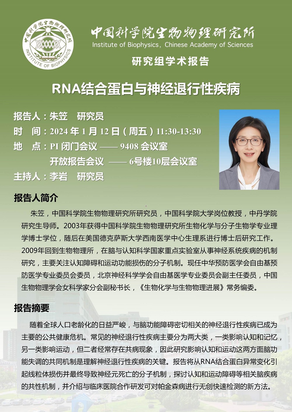 2024年1月12日中午11:30 研究组学术报告:RNA结合蛋白与神经退行性疾病